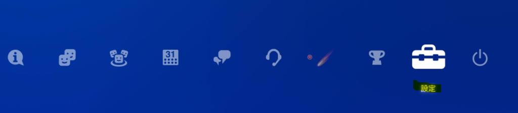 コントローラーの(PS)ボタンを押し、上を押すとアイコンが複数表示されるので、「設定」を選びましょう。